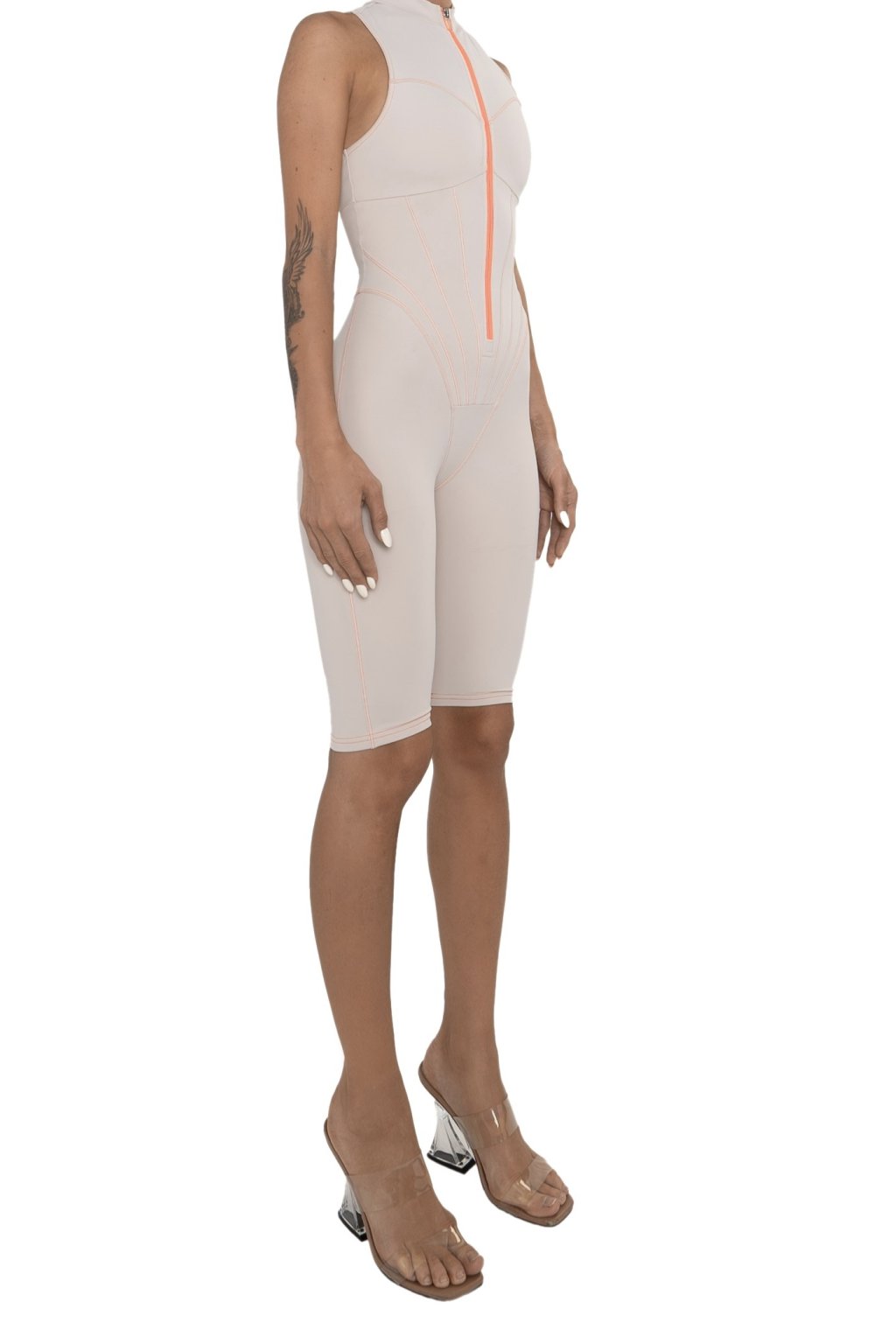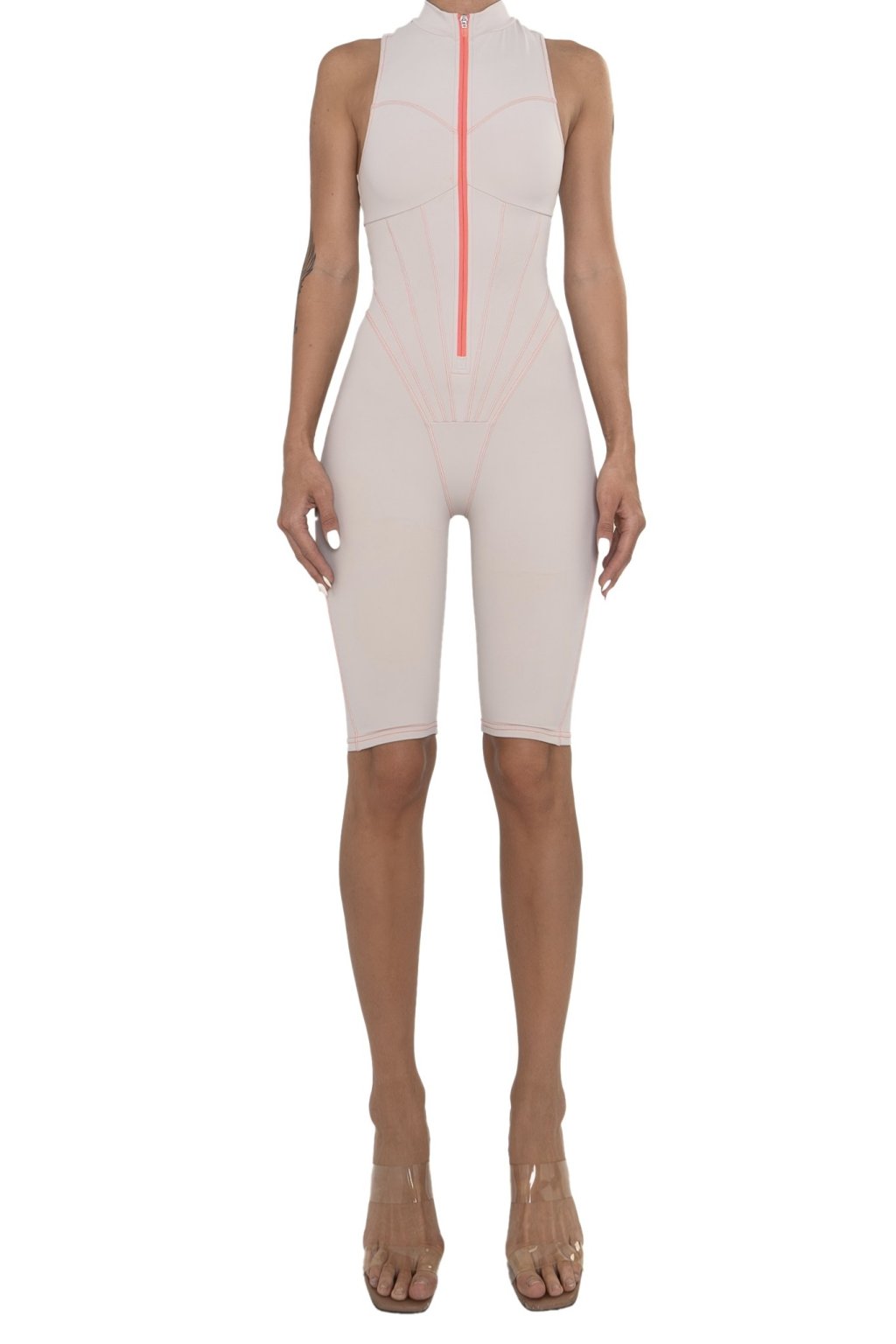 Elegantný overal bez rukávov v béžovej farbe s výrazným ružovým zipsom, ktorý spája ženskosť, komfort a moderný dizajn.