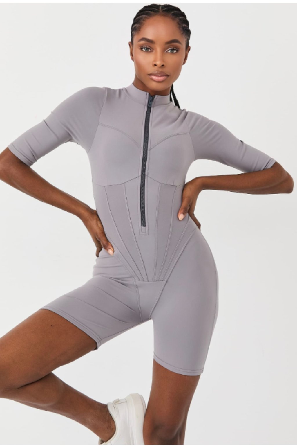 Elegantný, zmyselný a extrémne ženský – sivý overal s imitáciou kože s hlbokým výstrihom a zipsom vpredu.