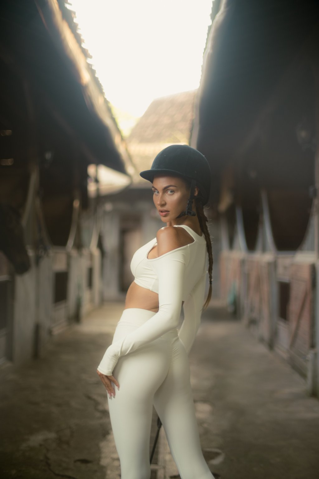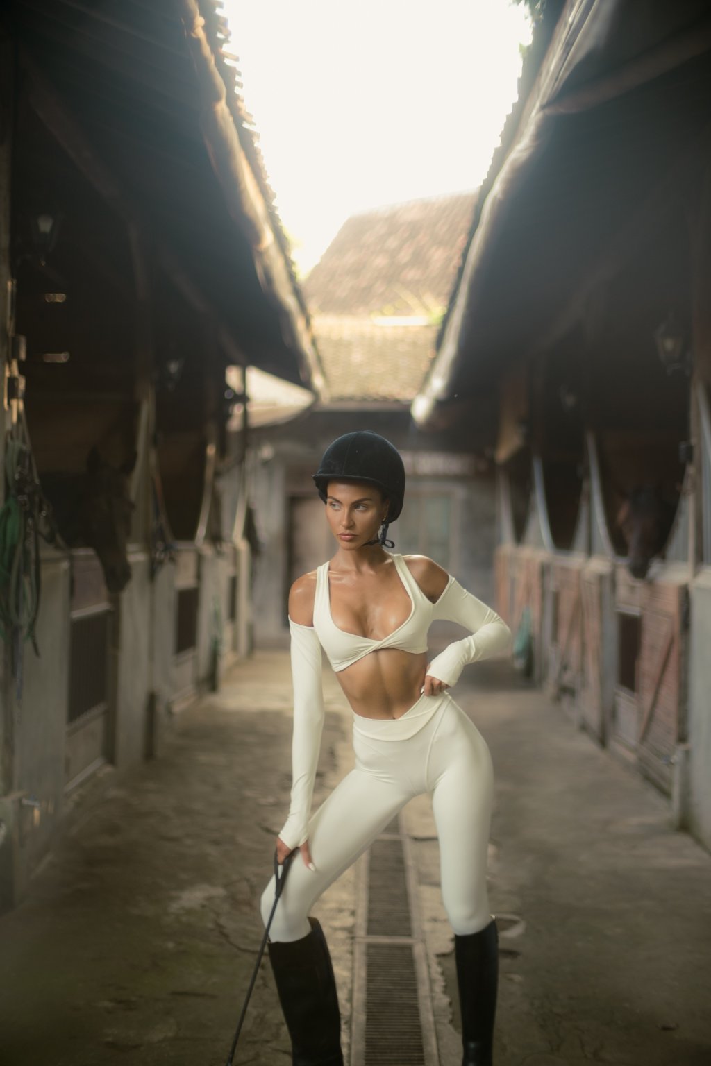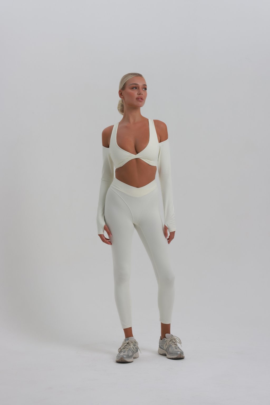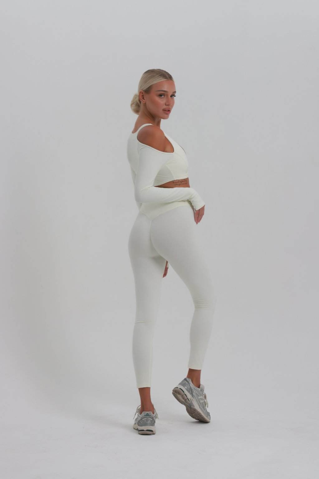 Set v jemnej maslovej bielej zvýrazní tvoju ženskosť s dokonalou ľahkosťou. Top s rafinovaným prestrihom a odhalenými ramenami pôsobí odvážne, no stále elegantne. Legíny s vysokým pásom krásne tvarujú siluetu, opticky predlžujú nohy a držia na mieste aj pri pohybe.