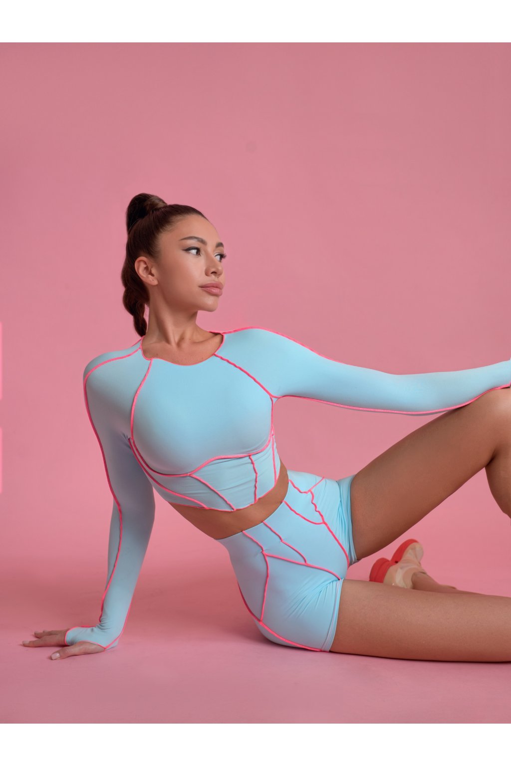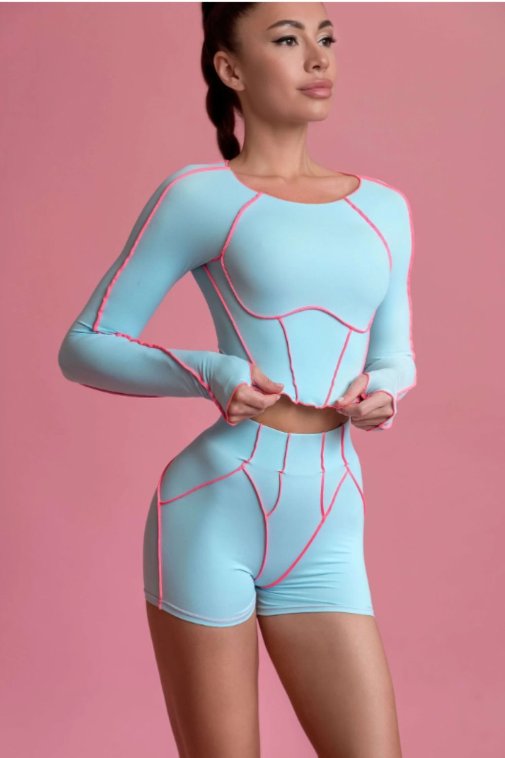 Ikonický dvojdielny set kombinuje športové línie s ultra ženským dizajnom. Top s dlhým rukávom krásne obopne hornú časť tela a zvýrazní pás, zatiaľ čo šortky s vysokým pásom vytvárajú efekt dlhších nôh.